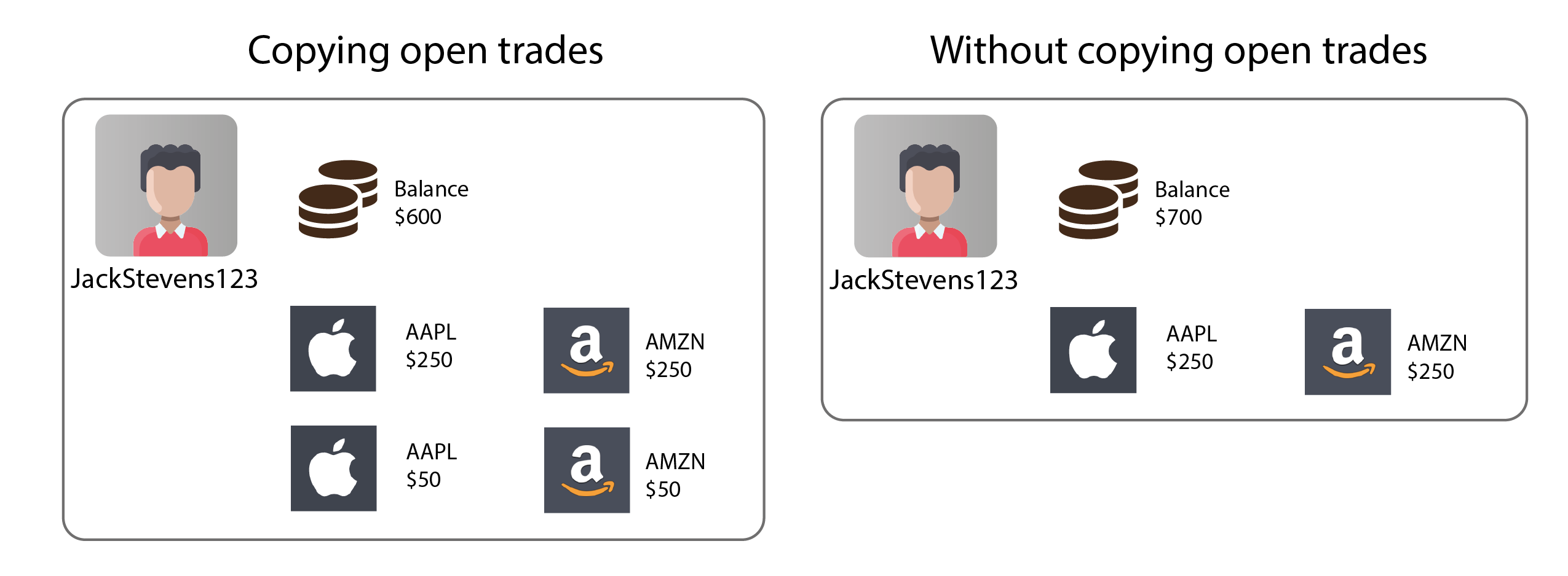 When copying open trades the platform will open new positions to keep the copy in the same proportions as the investor.