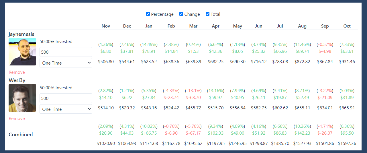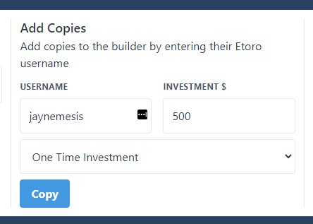 The next step is to add the popular investors to your portfolio. You just need to enter their username, how much you want to copy them with and how you want to copy them. The one time investment option means that the amount you enter will be once at the start of the time frame. The Monthly Investment option means that the amount you enter will be added to the copy every month of the time frame. This example shows a copy of Jaynemesis with a one time investment of $500.