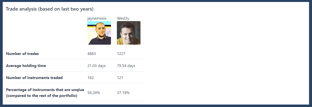 In the example below you can see the difference between jaynemesis’s and Wesl3y’s trading strategies. Wesl3y makes significantly less trades than jaynemesis but holds them for much longer.